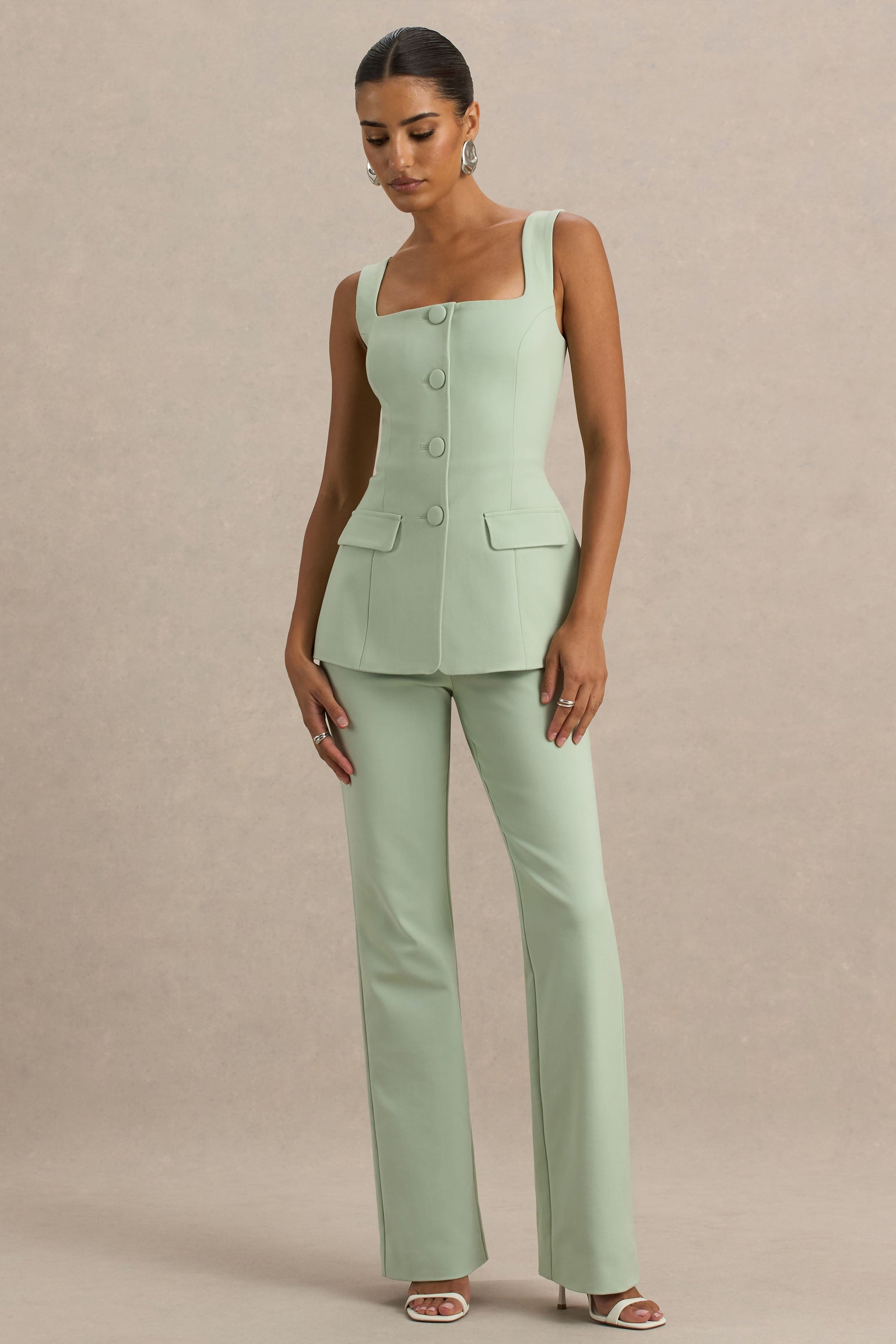 Aceline | Light Green Square-Neck Tailored Jumpsuit
