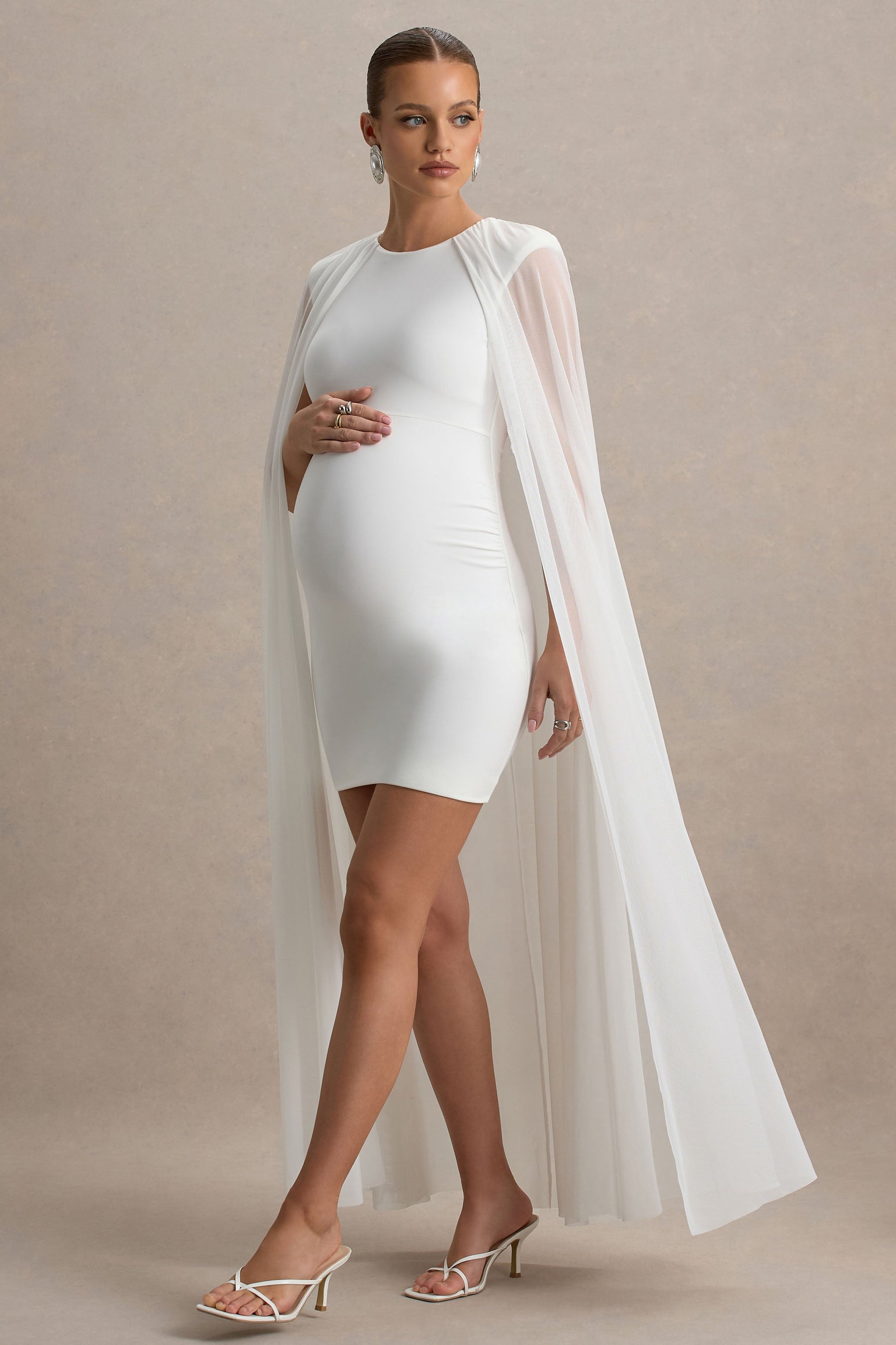 Charlene | White High-Neck Maternity Mini Dress With Mesh Cape
