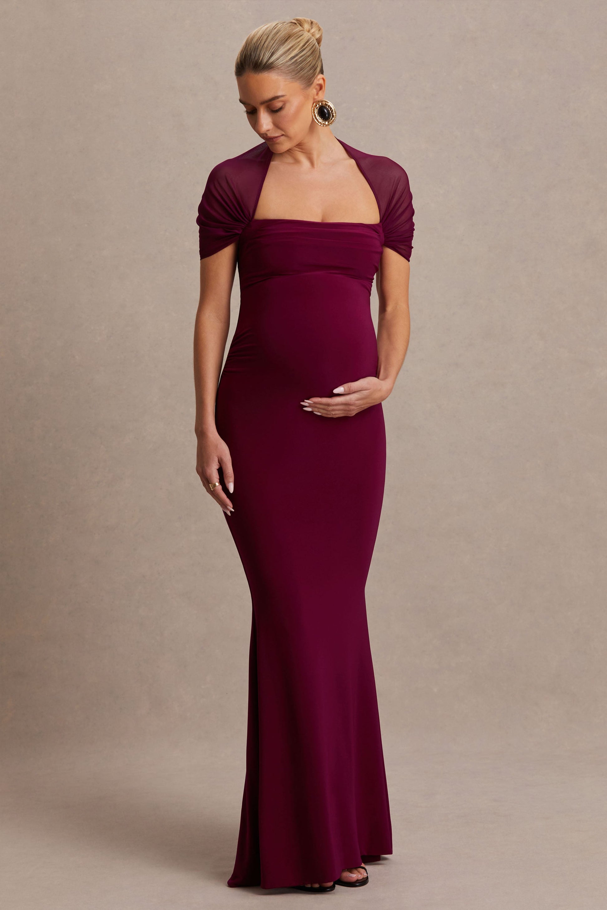 Make an unforgettable entrance in Dome, the perfect maxi designed to enhance your silhouette with elegance. Crafted from our premium stretch jersey in a bold burgundy shade, this statement piece is the epitome of refined glamour. The chic square neckline beautifully frames your decolletage, while the mesh sleeves add a touch of allure. Designed with carefully placed ruching to flatter your bump and create a seamless fit, Dome offers both comfort and confidence. Perfect for any upscale occasion, in this gown you will feel as radiant as you look.