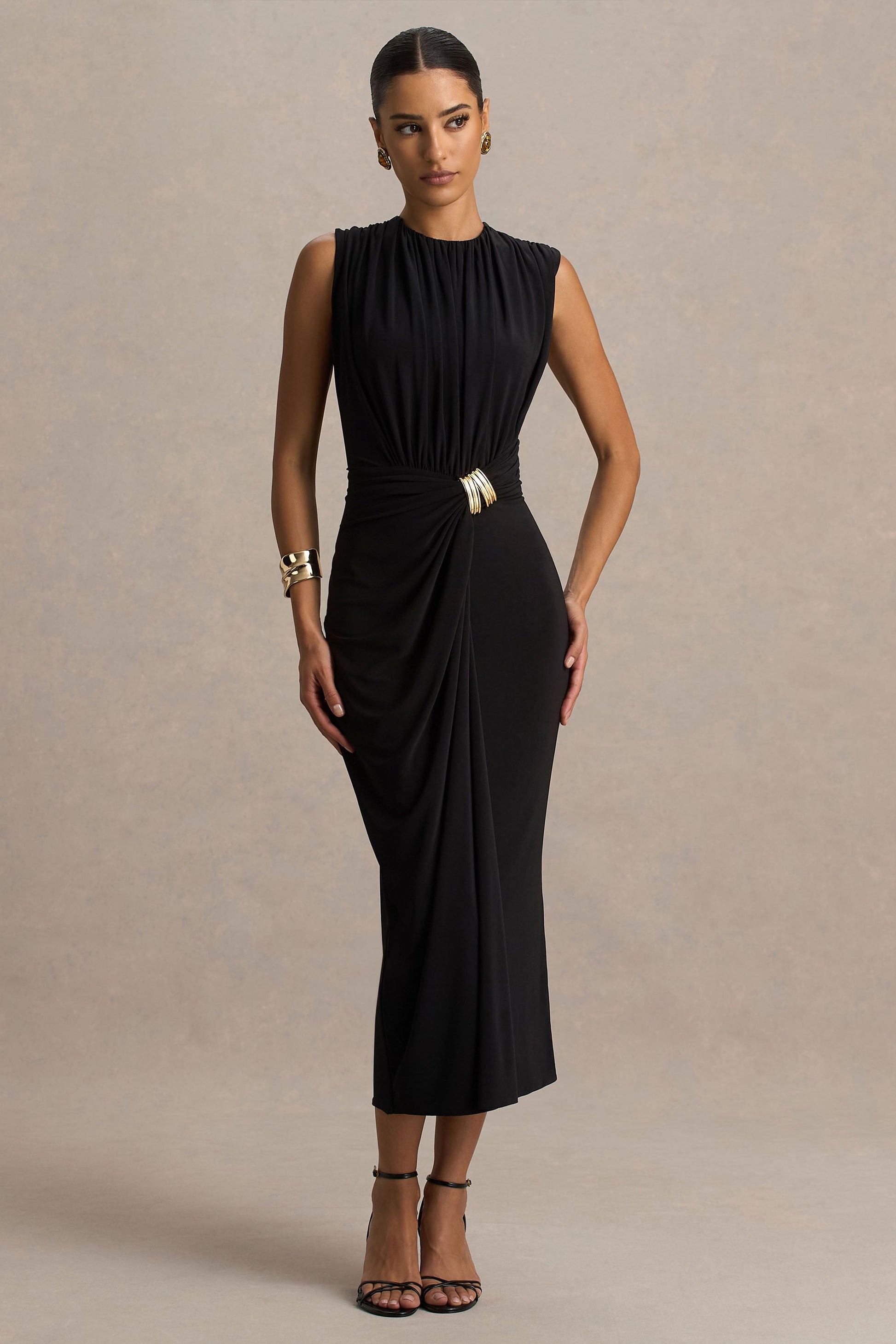 Turn heads in Harlow, a sleek piece made for stand-out moments. Designed in a deep black of our premium stretch jersey, this midi gown flatters from every angle. Featuring a classic crew neckline and elegant gathered detailing, this dress exudes chic elegance. The wrap skirt threads through gold hardware at the waist, adding a sophisticated touch of glamour. Perfect for evenings where you want to feel confident, polished, and unforgettable.