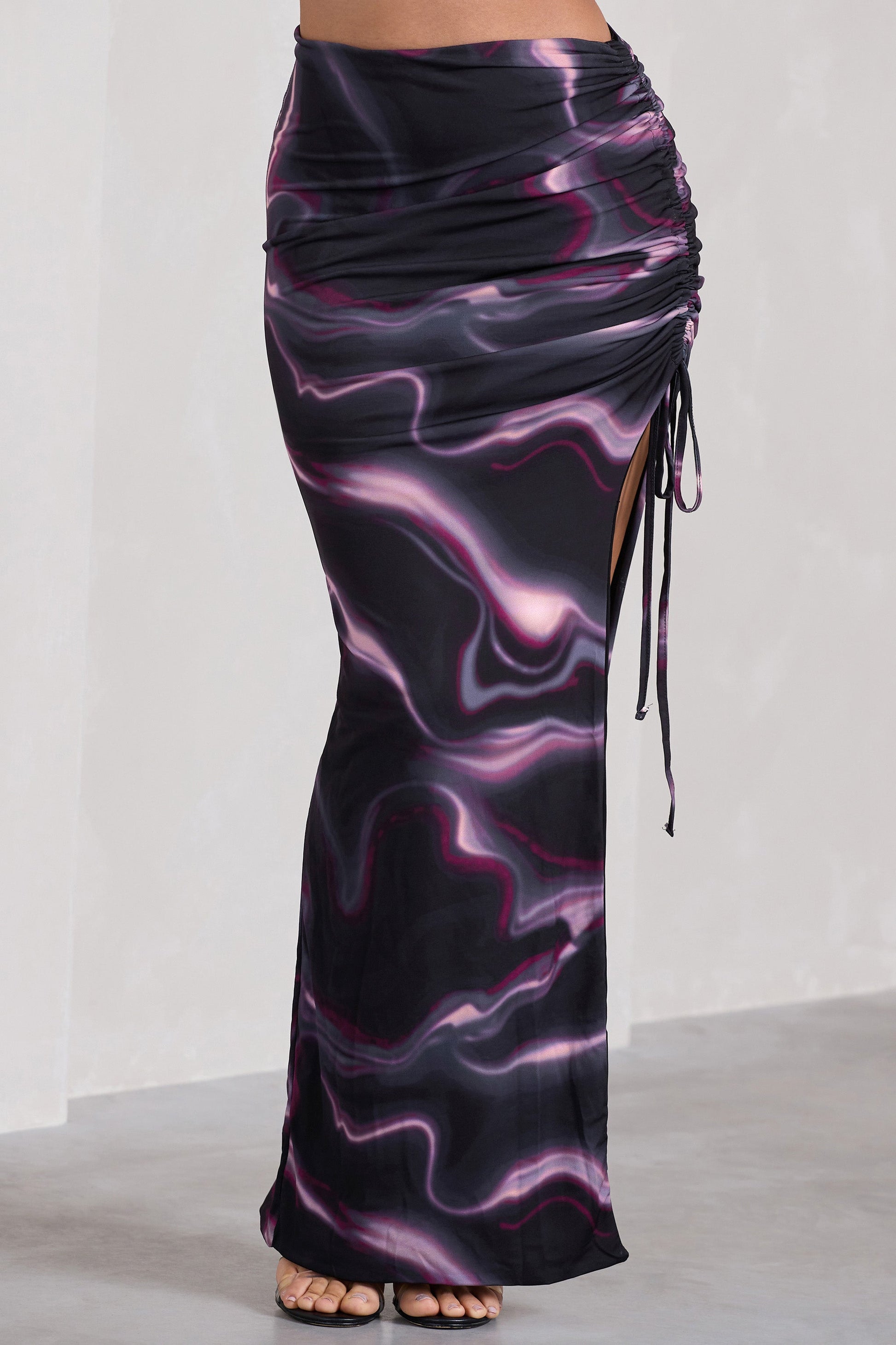 In The Air | Black Printed Ruched Asymmetric High-Waisted Maxi Skirt