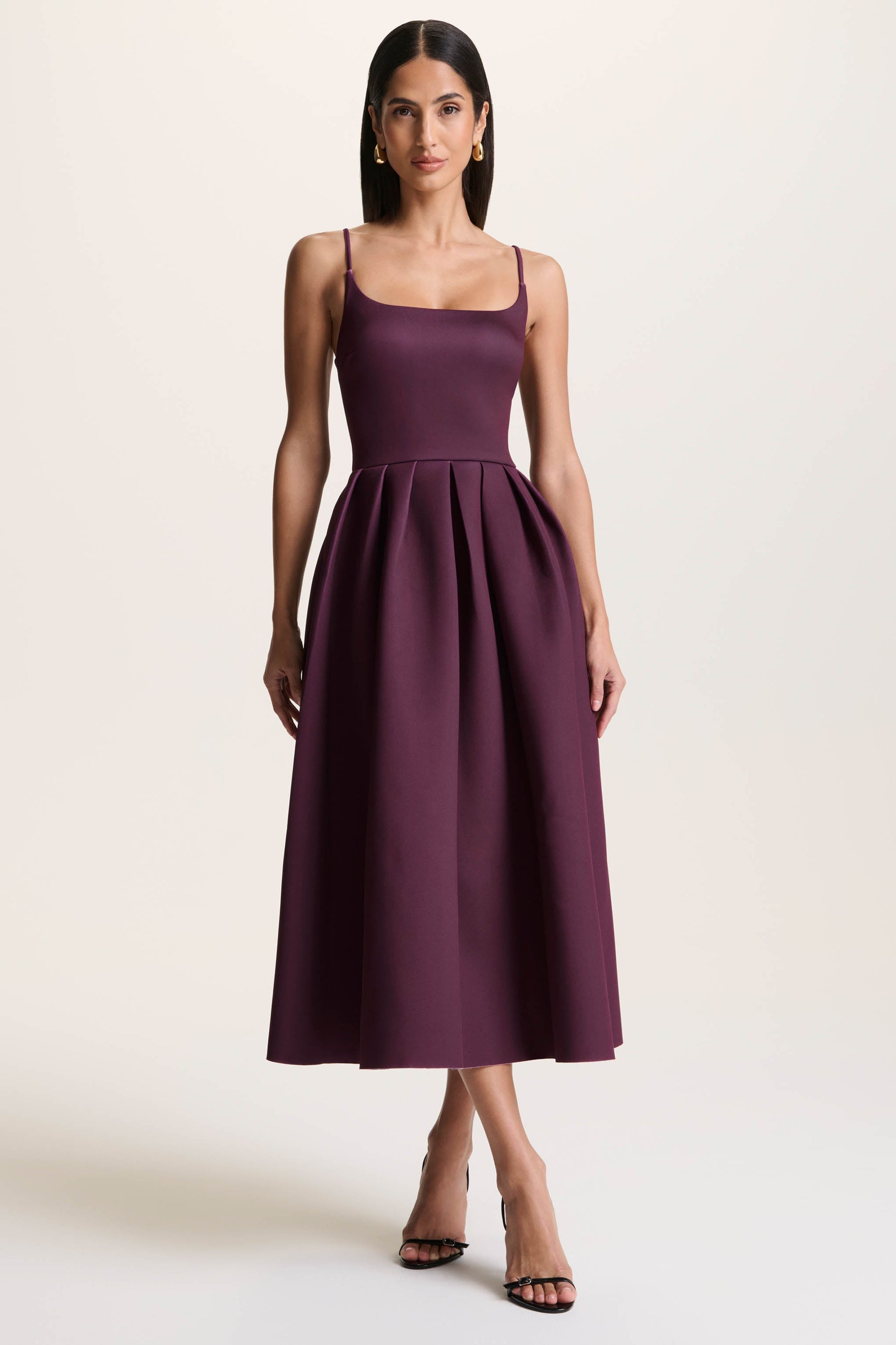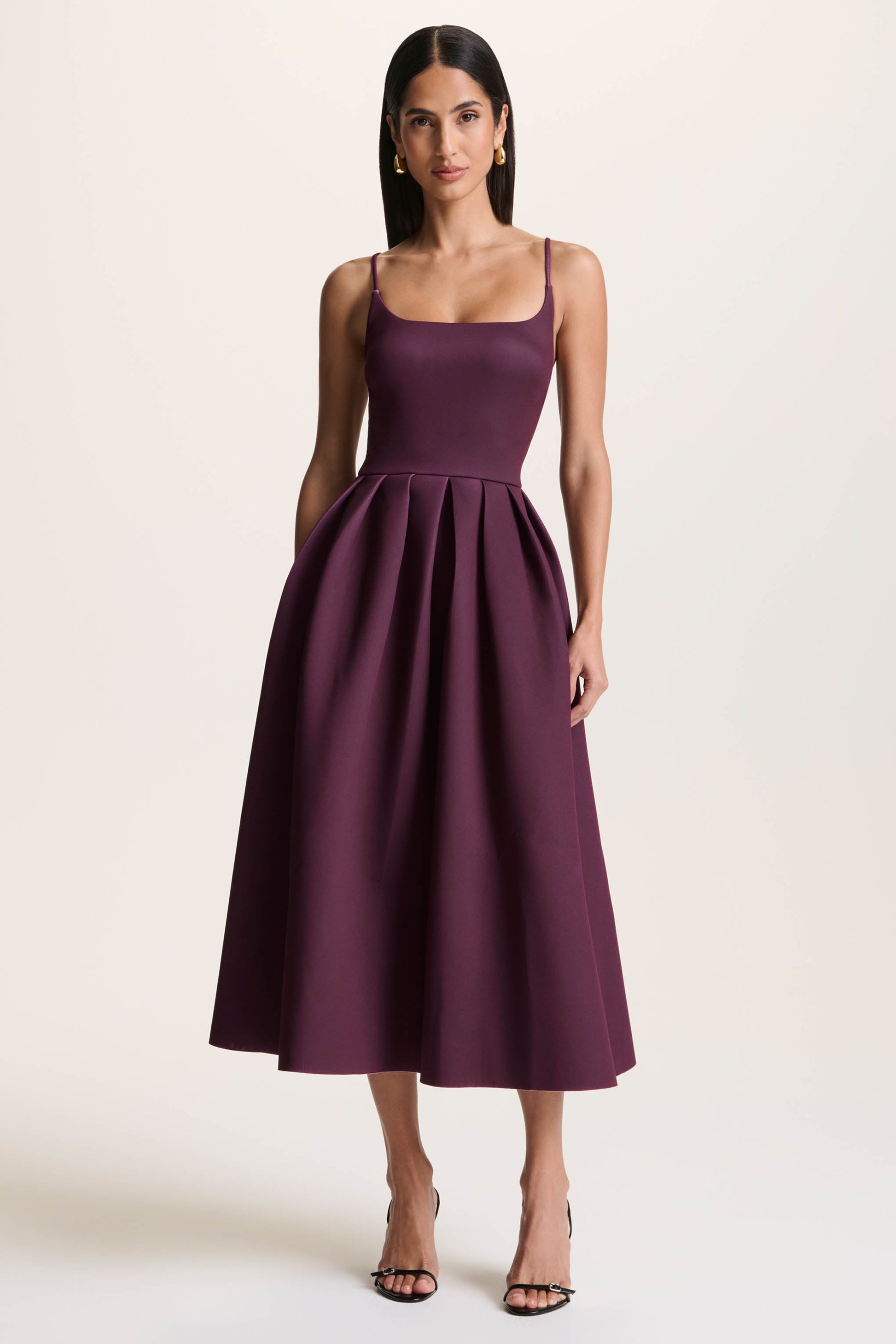 Say hello to Jamila, a sophisticated staple with a romantic edge. Crafted from our premium scuba crepe in a rich plum hue, this midi dress flatters the figure while offering sleek structure. The scoop neckline and adjustable straps create a perfectly tailored fit, while the pleated skirt adds graceful movement and timeless charm. Elegant, feminine, and endlessly versatile, Jamila is made for every special moment.