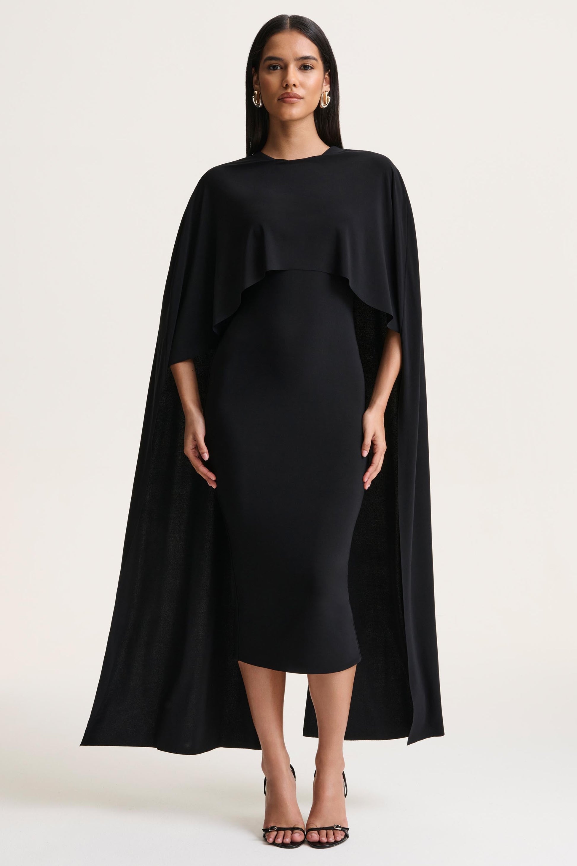 Kalani pairs sleek minimalism with a touch of dramatic elegance. Crafted from our premium black stretch jersey, this midi smooths and sculpts the silhouette with effortless ease. The crew neckline offers a clean, modern finish, while cape sleeves introduce statement presence. Complete with a centre-back split, Kalani embodies contemporary sophistication made for any standout occasion.