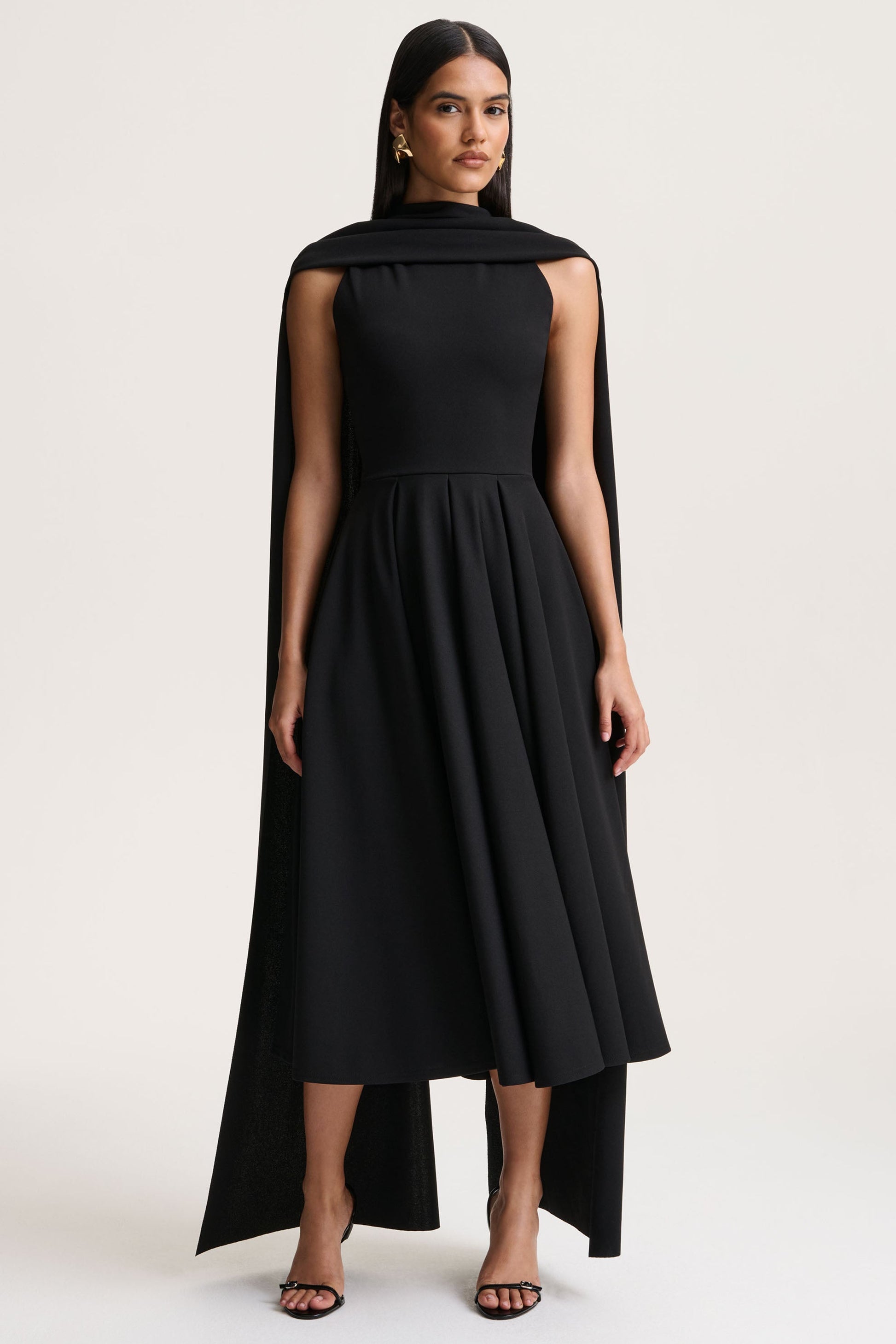 Nova redefines classic elegance with a statement finish. Crafted from our premium scuba crepe in timeless black, this midi-length design combines sleek structure with graceful movement. The high neckline exudes sophistication, while the dramatic back cape detail adds a touch of modern glamour. Finished in an A-line silhouette for a flattering shape, Nova is made for moments that demand understated drama and refined style.