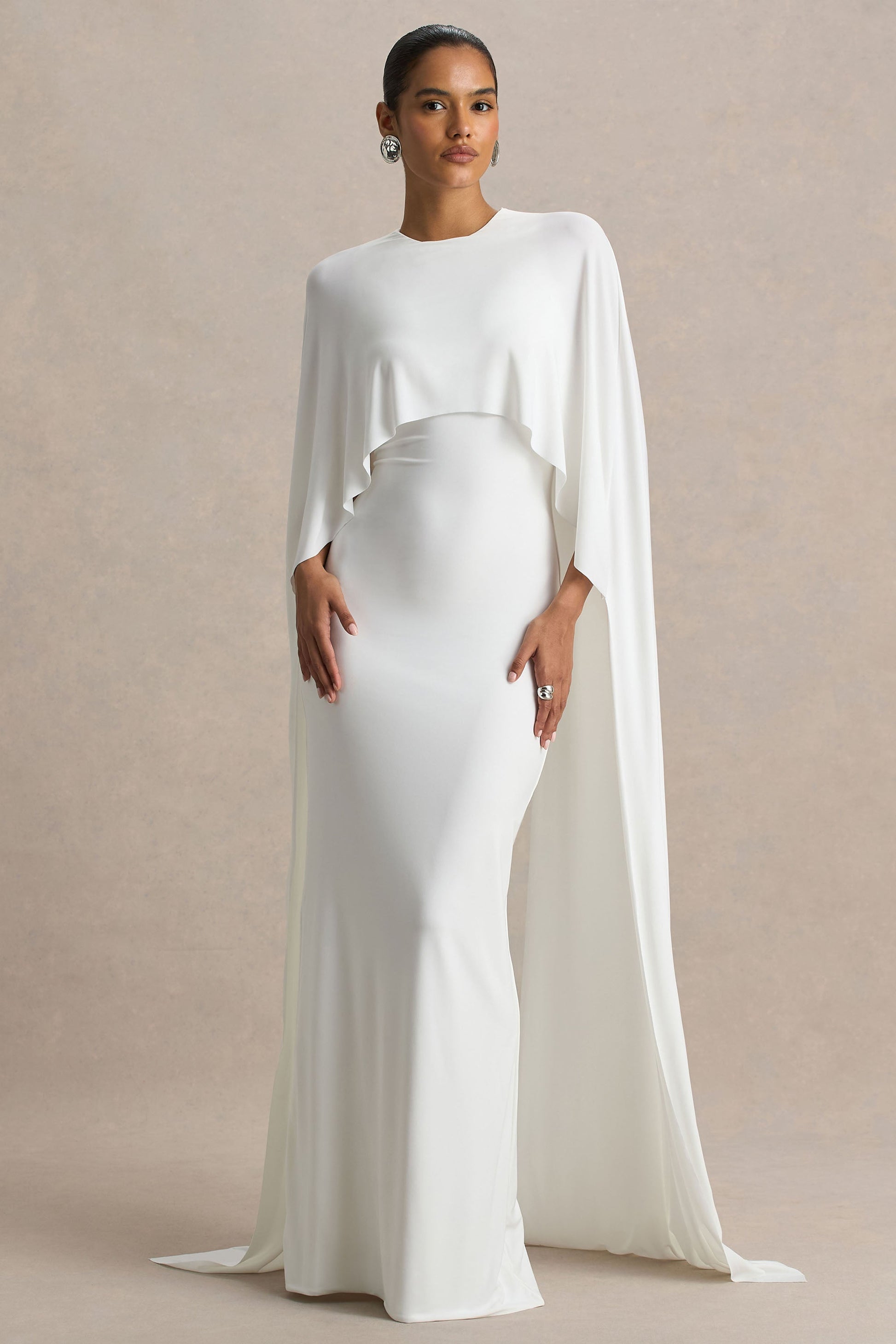Captivate from all angles in Padma, our opulent white maxi dress. Crafted in a premium stretch jersey, Padma sculpts your frame with a flattering bodycon fit. Defined by floor length cape sleeves that command attention, try styling yours with a sleek bun and our Sanya earrings for the ultimate occasion look.