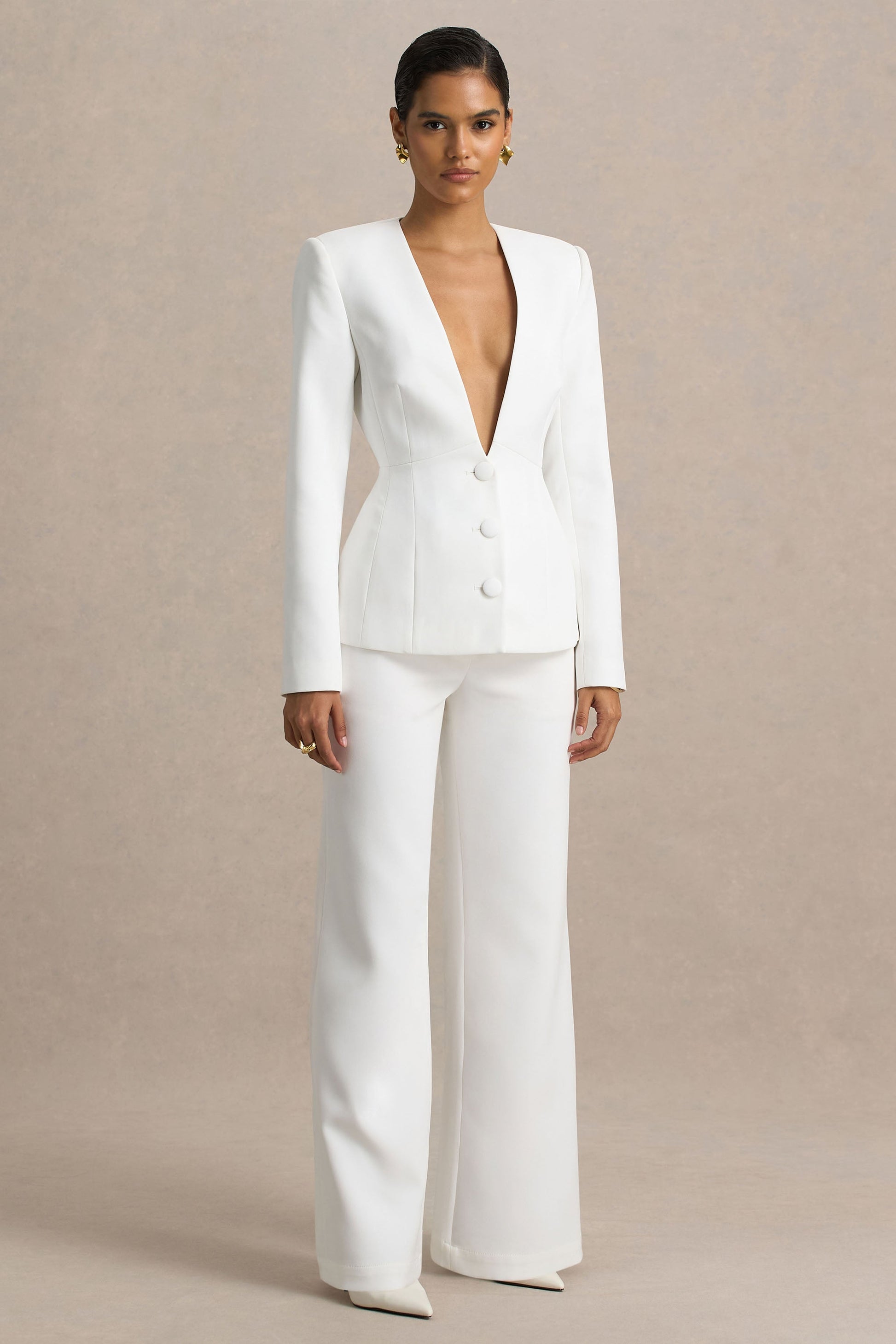 Introducing Silvia, a versatile wardrobe staple that's tailored to perfection for modern elegance. Crafted from our premium stretch crepe in a classic white hue, these trousers are designed to flatter while exuding timeless sophistication. Featuring angled pockets that nod to sleek tailoring and a fluid wide-leg silhouette that elongates the frame, Silvia transitions seamlessly from desk to dinner. Pair with our Rosalina blazer for a look that'll command attention.