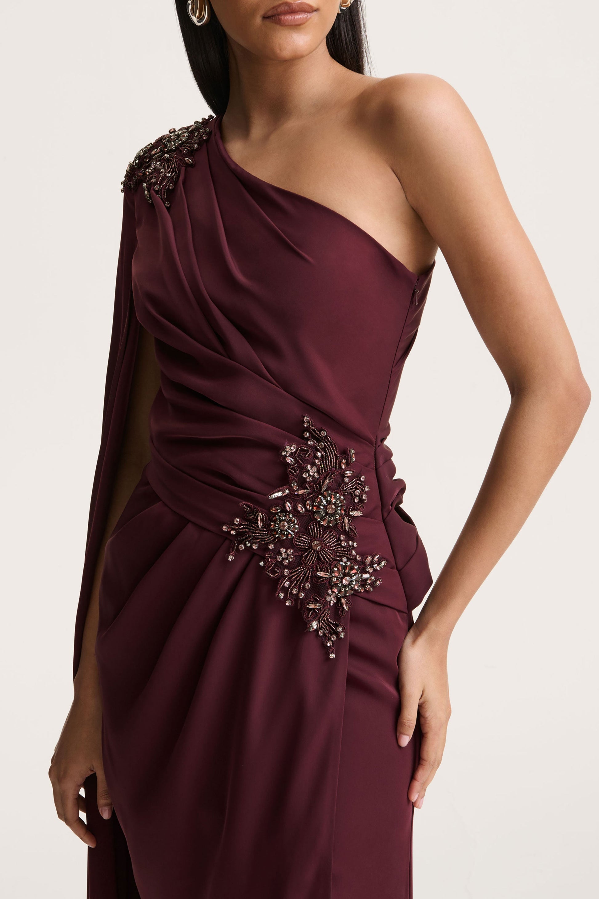 Make an entrance in Solace a statement gown designed for the spotlight. Crafted from pour remium crepe in a rich dark plum hue, it sculpts the body beautifully for a flattering, hourglass fit. The asymmetric neckline brings a modern edge, while the embellished detailing adds a touch of luxe sparkle. Finished with a daring front high split, Solace is the definition of sophisticated allure, perfect for those who love to make an entrance.
