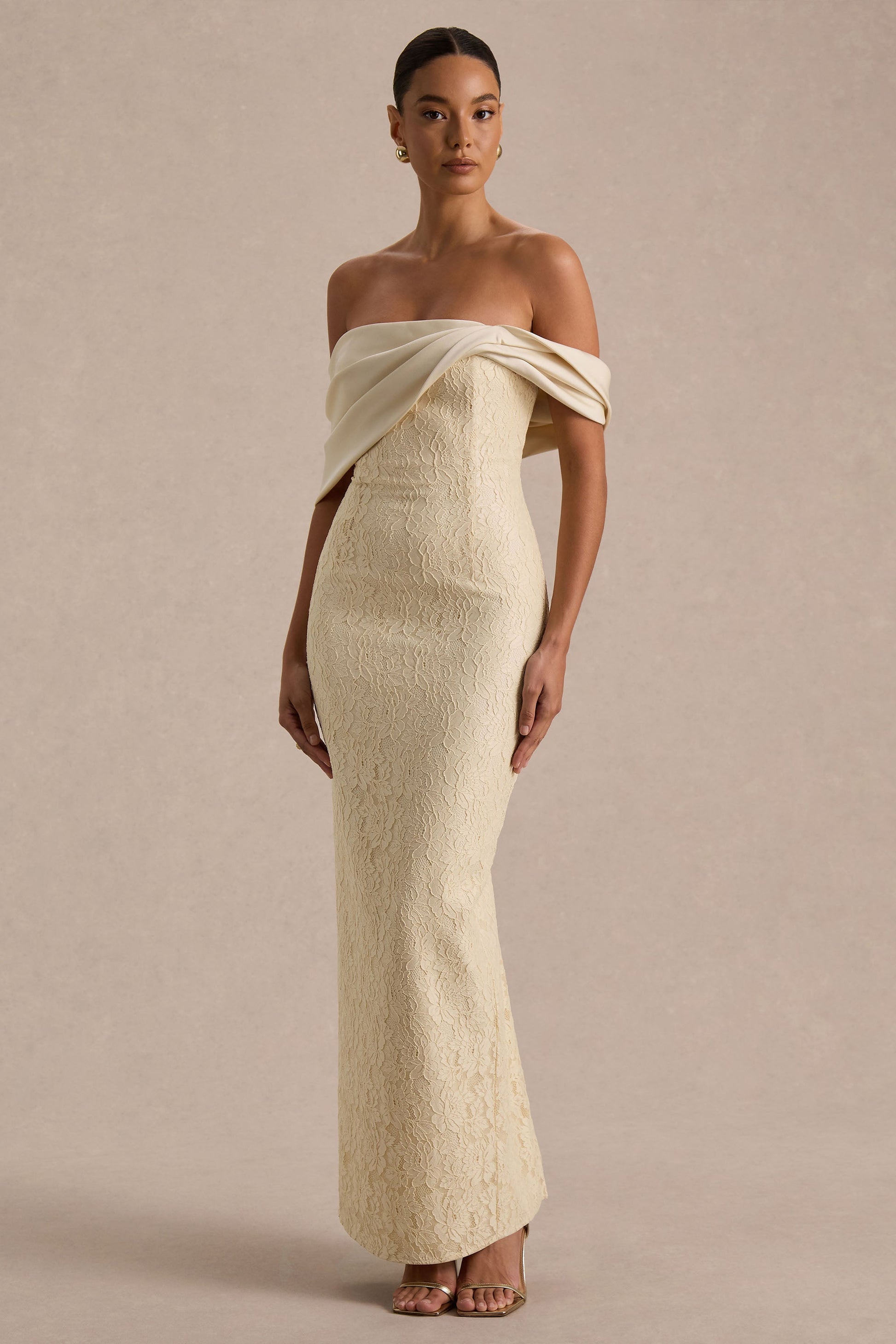 Effortless elegance meets modern romance in Solora. Crafted from our premium cream lace, this maxi dress is all about timeless glamour. Featuring a twisted bardot neckline that frames the shoulders, while the centre-back split adds a subtle touch of drama. Flowing, feminine, and unforgettable, Solora is the ultimate choice for evenings where sophistication and statement style collide.