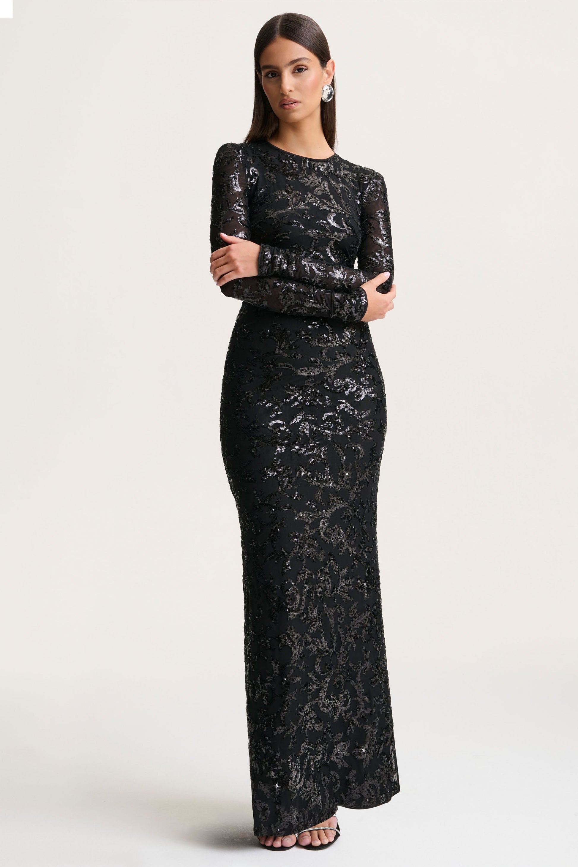 Shine bright and steal the spotlight in Stellar your go-to for unforgettable evenings. Cut from our premium black embellished lace, this maxi-length showstopper exudes elegance from head to toe. With a chic crew neckline and delicate long sleeves, it’s all about timeless sophistication with a hint of allure. The intricate lace detailing catches the light beautifully, making every movement mesmerizing. Perfect for black tie events, weddings, or any occasion where you want to leave a lasting impression.