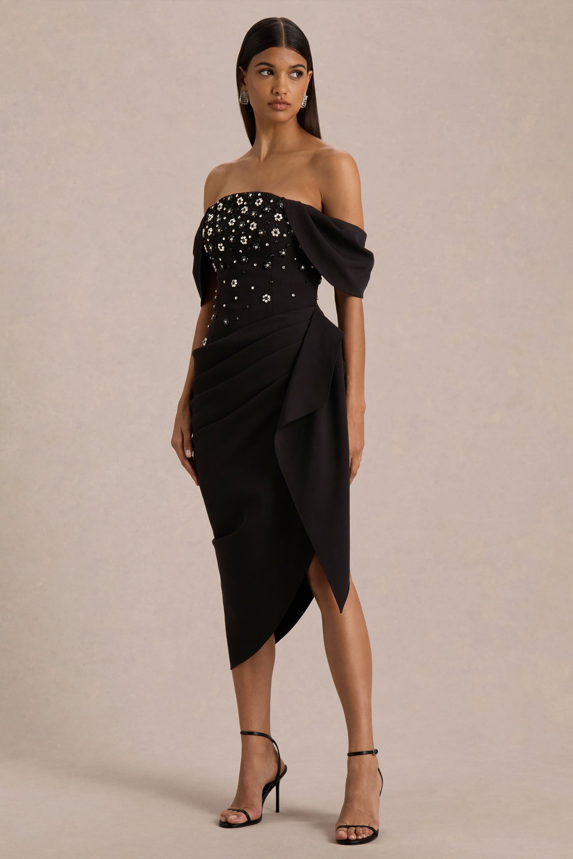 Sylvia | Black Hand-Embellished Bardot-Neck Midi Dress With Draped Satin-Wrap Skirt