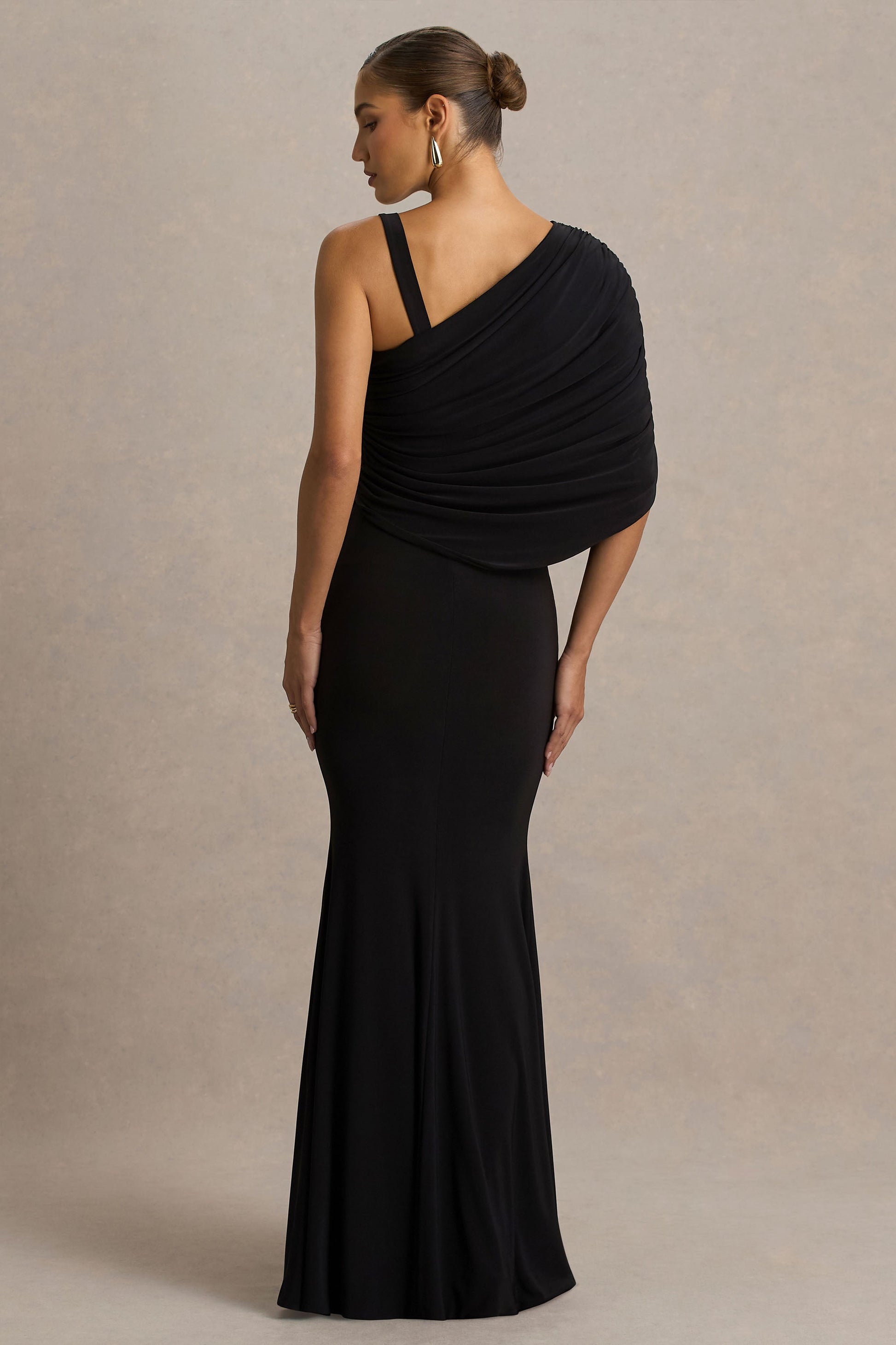 Steal the spotlight in Sylvie, a striking maxi designed to sculpt and flatter. Crafted from our premium stretch jersey in a bold black hue, this gown features an asymmetric neckline that frames the shoulders with modern elegance. A draped overlay with gathered detailing enhances the silhouette, creating soft movement that flows into a sweeping maxi length. Effortless yet impactful, Sylvie is made for unforgettable entrances.