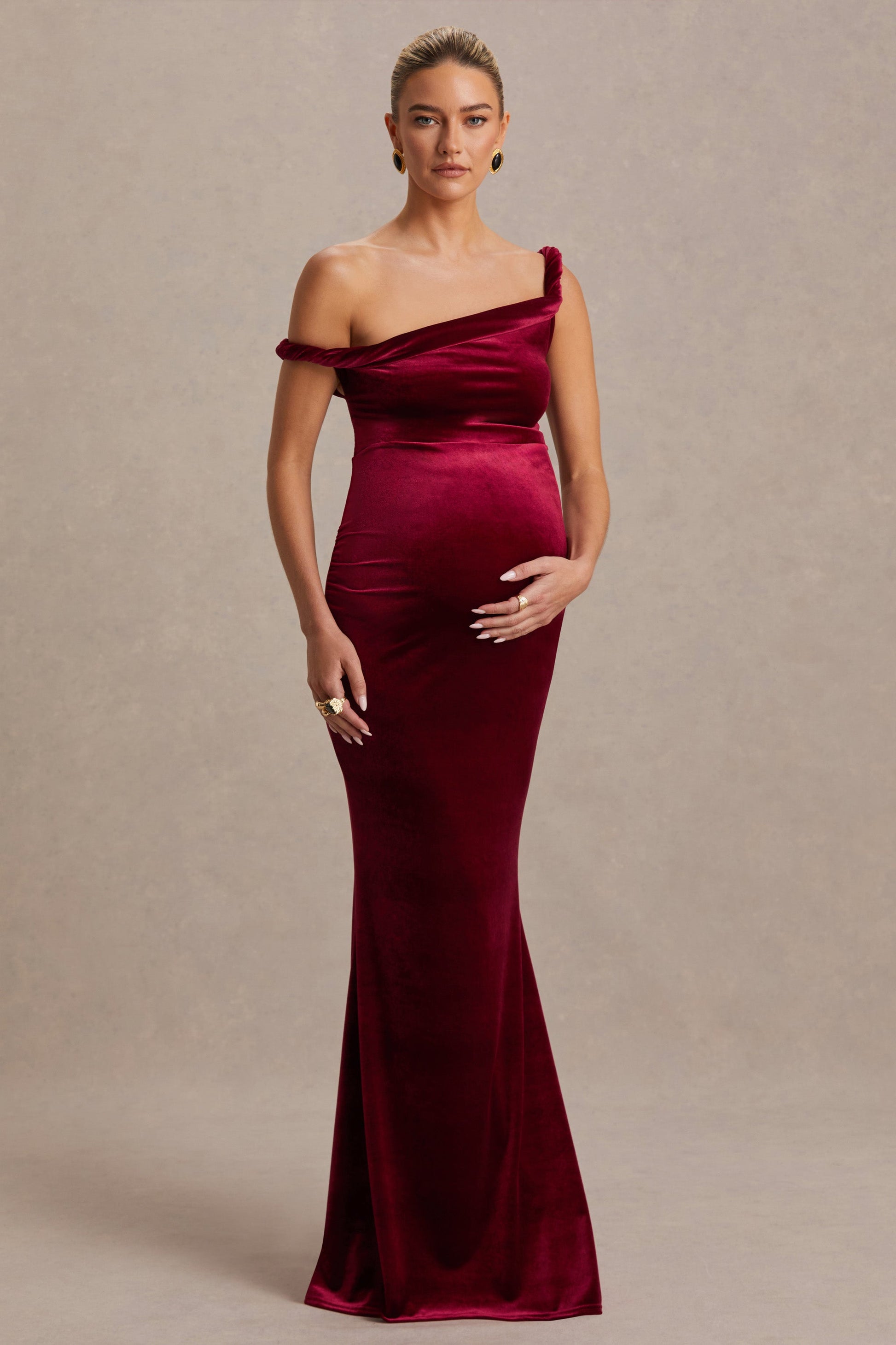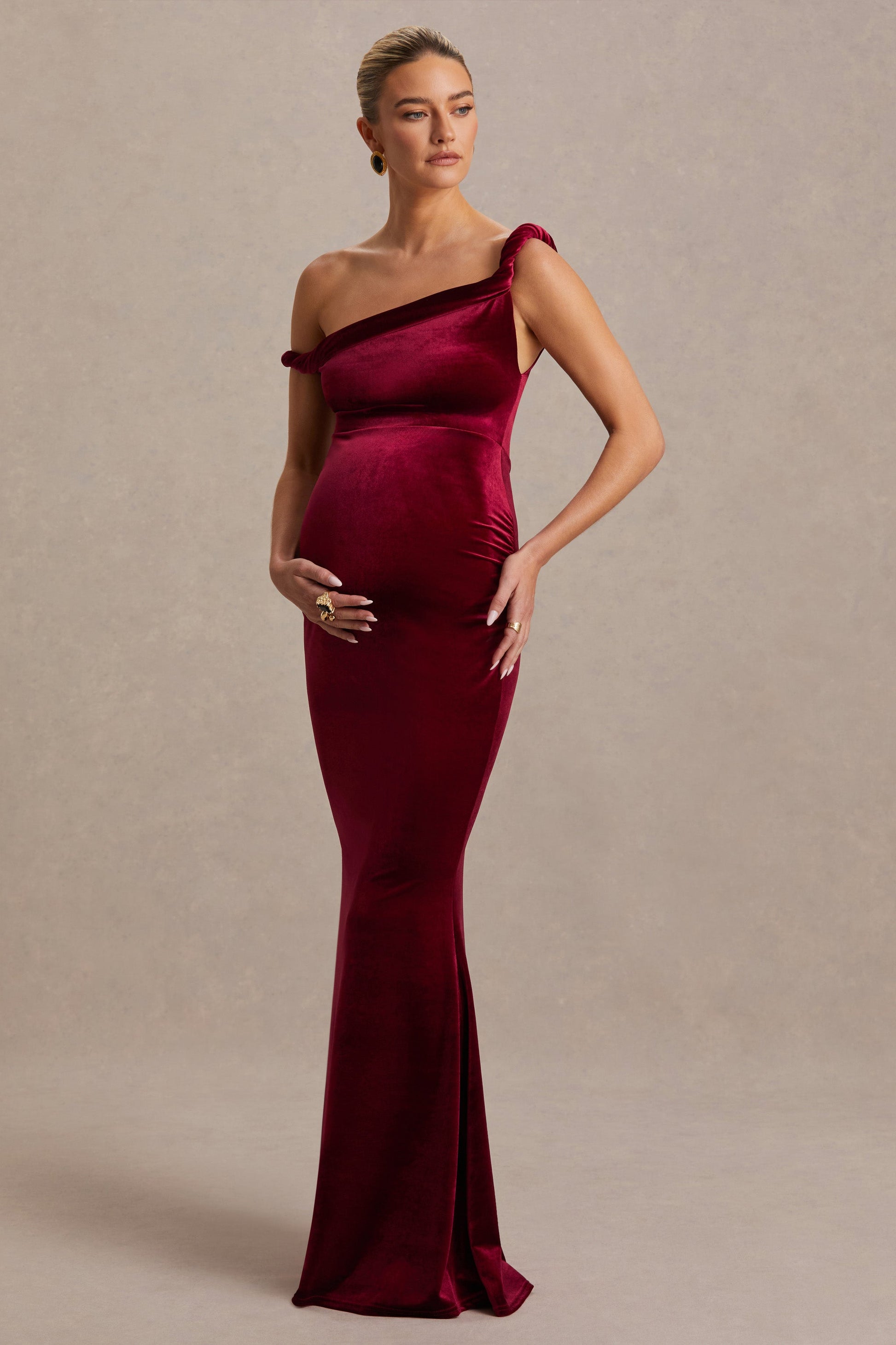 Tallulah | Burgundy Velvet Asymmetric-Neck Maternity Maxi Dress With Twist-Sleeve