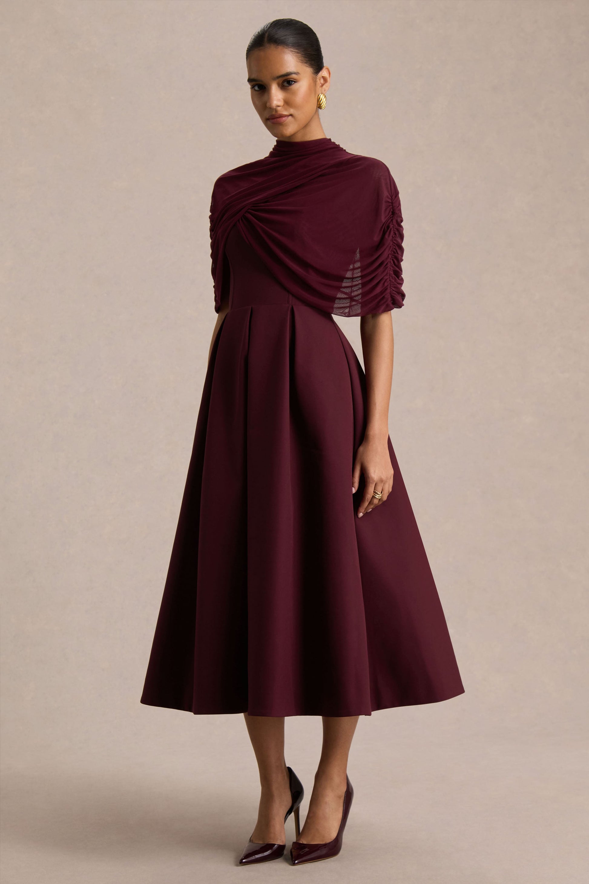 Thalia | Burgundy High-Neck Midi Dress With Sheer Mesh Cape