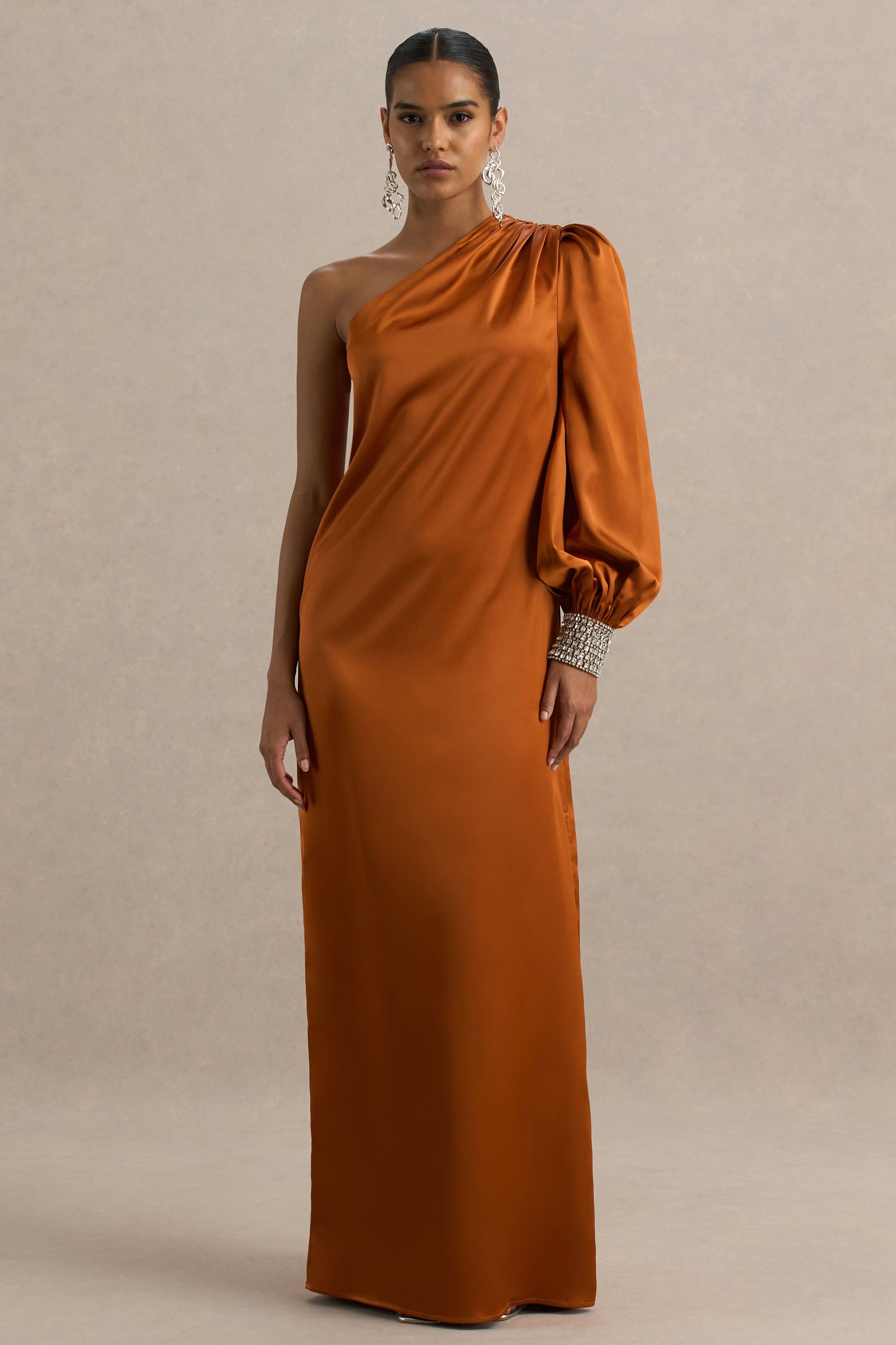 Enchant and captivate in Thelma, the statement maker you need for your next occasion. Crafted in a rich orange shade of our premium satin, this gown effortlessly moves with every gesture. Featuring a sleek asymmetric neckline, for a touch of modernity, and a long sleeve with a breathtaking embellished cuff. Finished with a daring side split for a hint of allure, In Thelma you will have all eyes on you.